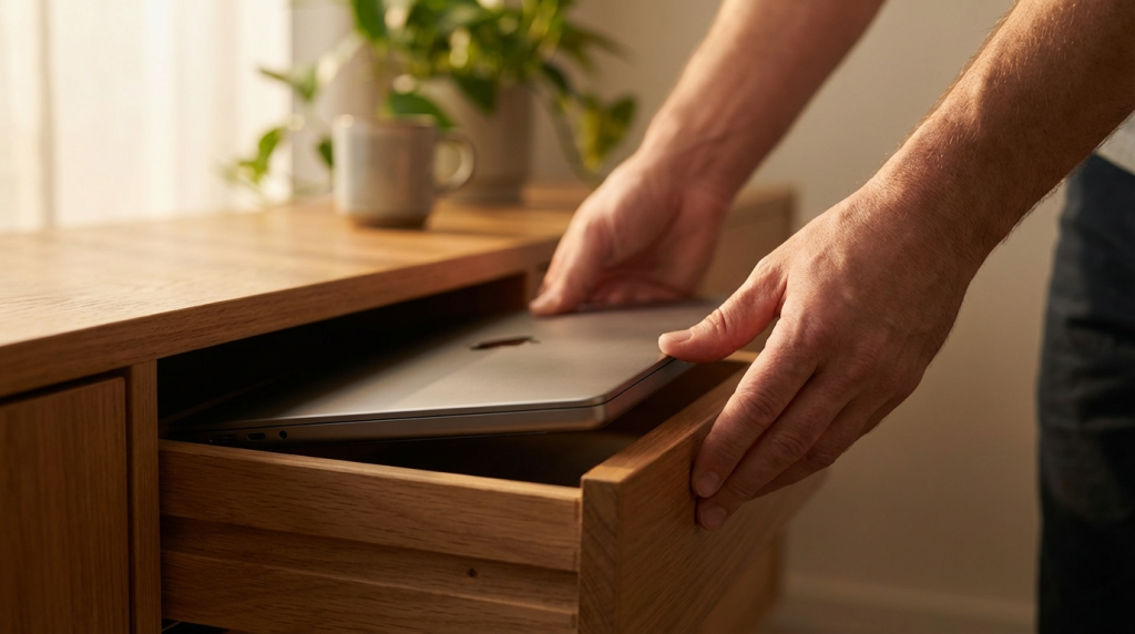 - A drawer or cabinet where the laptop goes at stop time — not visible from the couch.